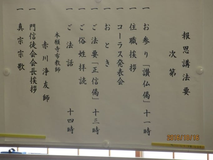 千葉県・埼玉県 · 16日 10月 2016 埼玉・春日部 福浄寺さん報恩講_2016-10-16 毎年、3回めの有り難いご縁です。 所属寺の座間恵光寺と同じ、初期の都市開教寺院です。 頑張っていらっしゃいます。 (1時間のご法話は、ちょっとキツかった皆さん、午前中からいらしてるから、仕方ないけど、、、 僕の場合、、、最低、1時間半は必要です。 いろいろ話が飛びますし、、、)(笑) tagPlaceholderカテゴリ: 浄土真宗, 埼玉 コメントをお書きください コメント: 0