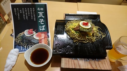 ↑名物「瓦そば」をいただく!茶そばといろいろな具とともに、焼いた瓦で食べます。ビールにピッタリ!(笑)
