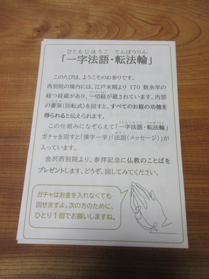 北陸 · 19日 5月 2024 金沢別院「日曜法話会」 金沢組主催、「日曜法話会」です。コロナ禍で4年延期になっていました。 タイトルは「笑いとともに考えるお念仏」。 金沢は、わが師、故花山勝友先生のご実家「宗林寺」さんがあります。若坊守さんが来てくださいました! ↑能登地震でお寺もかなりの被害が、、、 ⇅おもしろい取り組み!!! ガチャを回すと、カプセルの中に「一文字法語」! ⇅100名近くの方々がいらっしゃいました! ↑「いのちの歌」「涙そうそう」「千の風になって」♪ tagPlaceholderカテゴリ: